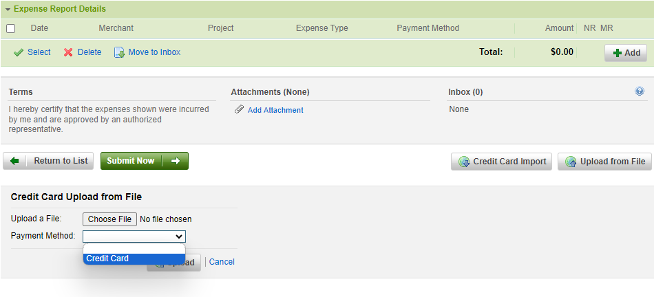 Selecting a payment method will apply the selected payment method to all of the uploaded transactions, and will flag the transaction as reimbursable or non-reimbursable, depending on the configuration of the payment method.