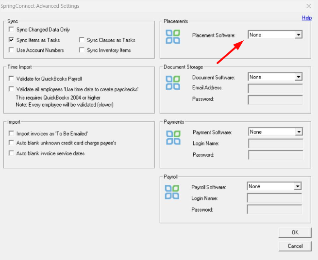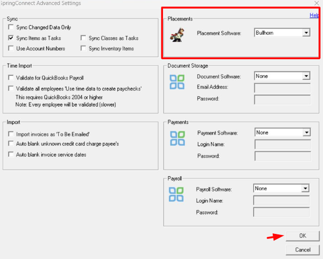 - The Placement Import menu will allow you to import to QuickBooks, SpringAhead, or both. Check the boxes for all of the line items to import and click Import when ready