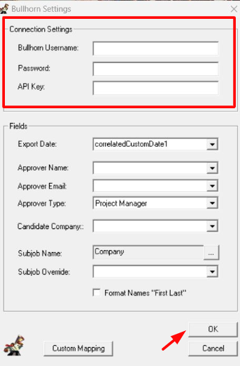 - Enter your Bullhorn Username, Password, and API Key and click Ok.